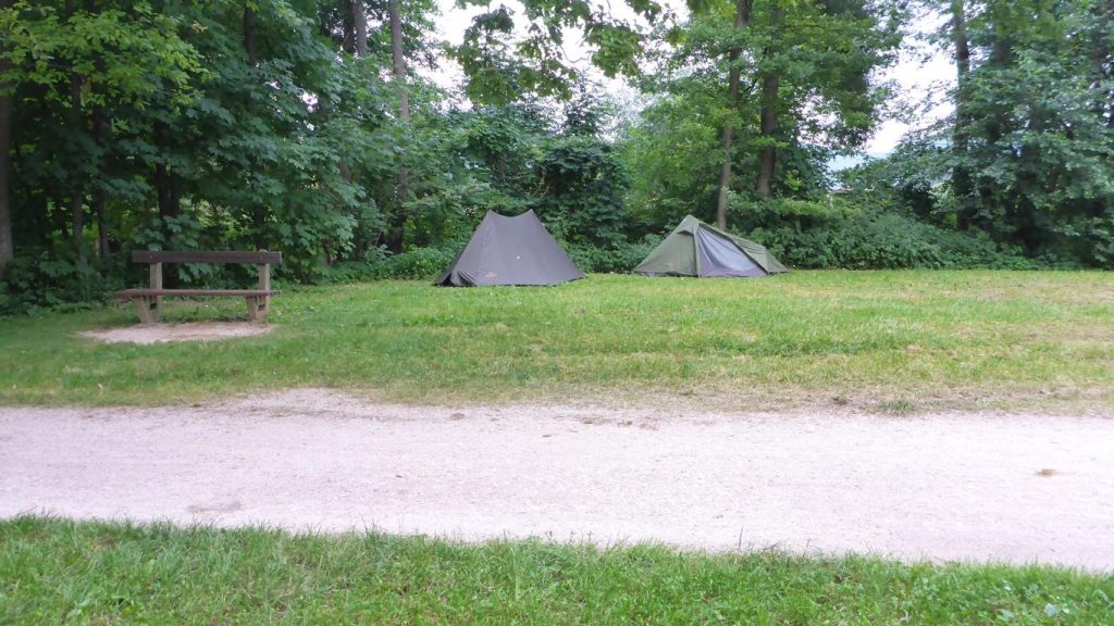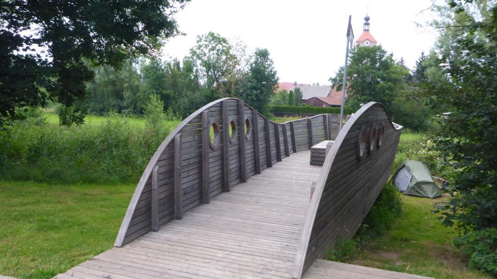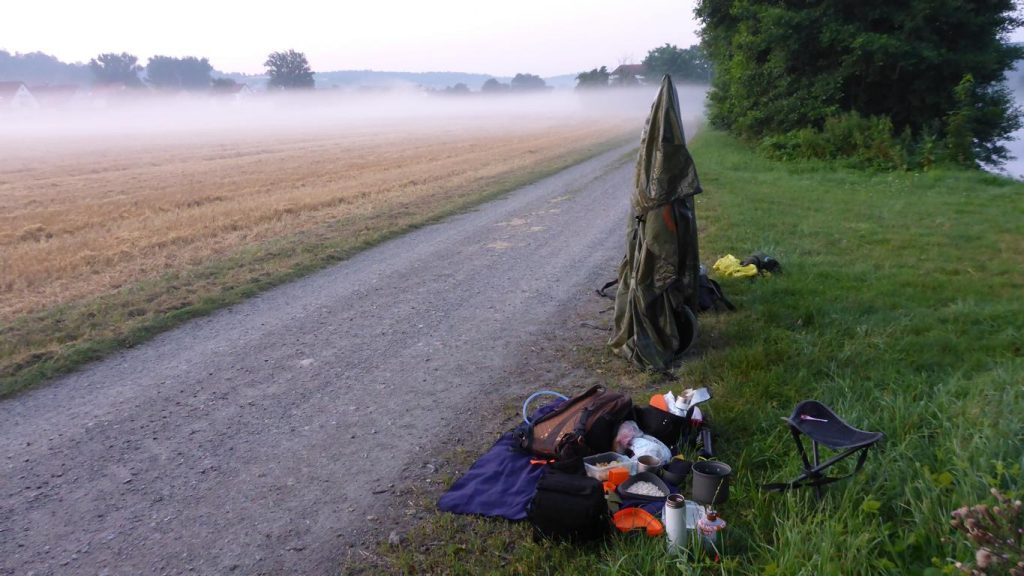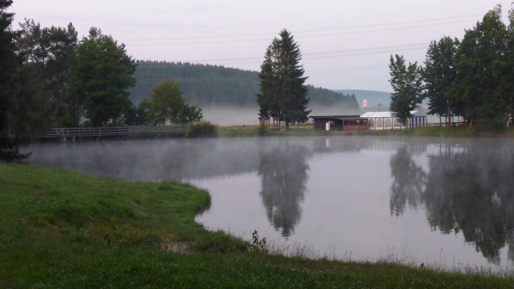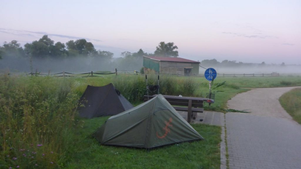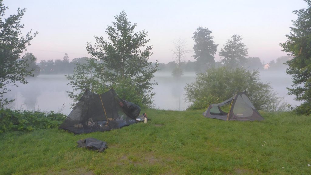 Dosyć szybko okazało się, że też nie, lub prawie nie. Wprawdzie nocowanie w namiocie na dziko, jak i sporo innych spraw faktycznie jest w Niemczech niedozwolone, ale istnieje jedno ale, o którym już wkrótce się dowiedzieliśmy, które sporo wyjaśniło i spowodowało, że i Niemcy pod względem obozowania w szuwarach, na łąkach, nad jeziorami lub rzekami okazały się zupełnie spoko krajem. Nad pierwszym napotkanym jeziorem o nazwie Sperlweiher koło wioski Moosbach, zapytałem, kręcącego się w pobliżu starszego mężczyznę, czy możemy na jedną noc rozbić się przy brzegu po drugiej stronie jeziora. W odpowiedzi usłyszałem – Eigentlich Verboten, aber…- właściwie zabronione, ale i tu urwał głos. Ale jak nikt was nie zobaczy to nic się nie stanie, a poza tym, dlaczego nie (?) Zakończył wyginając wymownie usta, poczym poczęstował nas dwiema butelkami wody i zaoferował, że gdybyśmy czegokolwiek jeszcze potrzebowali, to śmiało możemy przyjść, bo będzie tu jeszcze do wieczora. Pisałem przed chwilą, że Niemcy to życzliwy i pomocny naród i teraz ponownie dostaliśmy tego potwierdzenie. Sylwek po raz któryś tego dnia zrobił z wrażenia wielkie oczy i coś mi się zdaje, że powoli zmieniał swój stereotypowy osąd o swoich zachodnich sąsiadach. Potem wspólnie śmiejąc się i rozbijając namioty wpajaliśmy sobie do łba dewizę, która będzie towarzyszyć nam już przez całą podróż przez Niemcy – Eigentlich Verboten, aber. Właśnie to „aber” sprawiło, że dalej poszło już jak z płatka.Następnego dnia w Wernberg-Köblitz znaleźliśmy wspaniałe miejsce w zatoce nad niewielkim jeziorem, którego poranna para, przy promieniach wschodzącego słońca wprawiła nas w niemały zachwyt. Takie poranne zjawiska będą się zresztą pojawiać teraz codziennie, jako że woda w jeziorach i rzekach już dobrze się nagrzała, a noce i poranki zaczynały być coraz chłodniejsze. Potem również nie nękani ani przez straż miejską, ani przez tubylczą ludność przespaliśmy się w niezbyt urodziwym miejscu w parku miejskim w Hahnbach. Za to kolejny nocleg nad Happburger Baggersee był po dwakroć wspaniały, bo nie dość, że w końcu można było popływać, poopalać się i nieco odpoczęć, to na dodatek natura stworzyła nam niesamowity spektakl w postaci zachodzącego słońca i mi (Sylwek tak wcześniej nie wstaje) jeszcze lepszy o wschodzie, gdy w pomarańczowych promieniach wynurzającego się zza gór słońca, szare unoszące się nad łąkami mgły, zlały się z widniejącymi w dali granatowymi wzgórzami. Szkoda tylko, że po takim pięknym poranku, dzień nie był już taki wspaniały i znowu trzeba było uciekać przed deszczem i burzami. Ostatni nocleg przed Norymbergą przyszło nam spędzić tuż przy moście nad rzeka Pegnitz, który ewentualnie mógł nam w nocy posłużyć, jako schronienie, aczkolwiek na szczęście obyło się bez ewakuacji. Namioty wytrzymały całonocną ulewę, a poranna tęcza przyniosła nadzieję na zmianę pogody. Niestety tylko nadzieję. Z przerwami padało jeszcze dwa następne dni, ale tym razem było nam to już obojętne.
