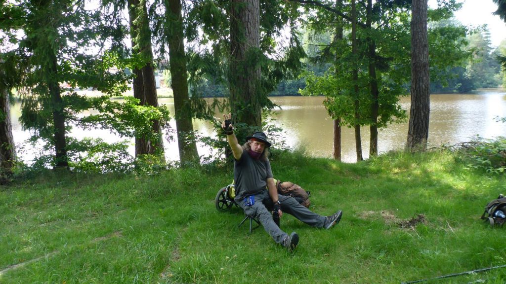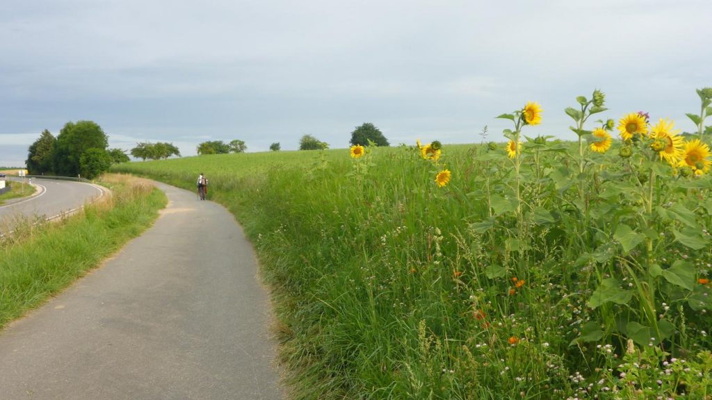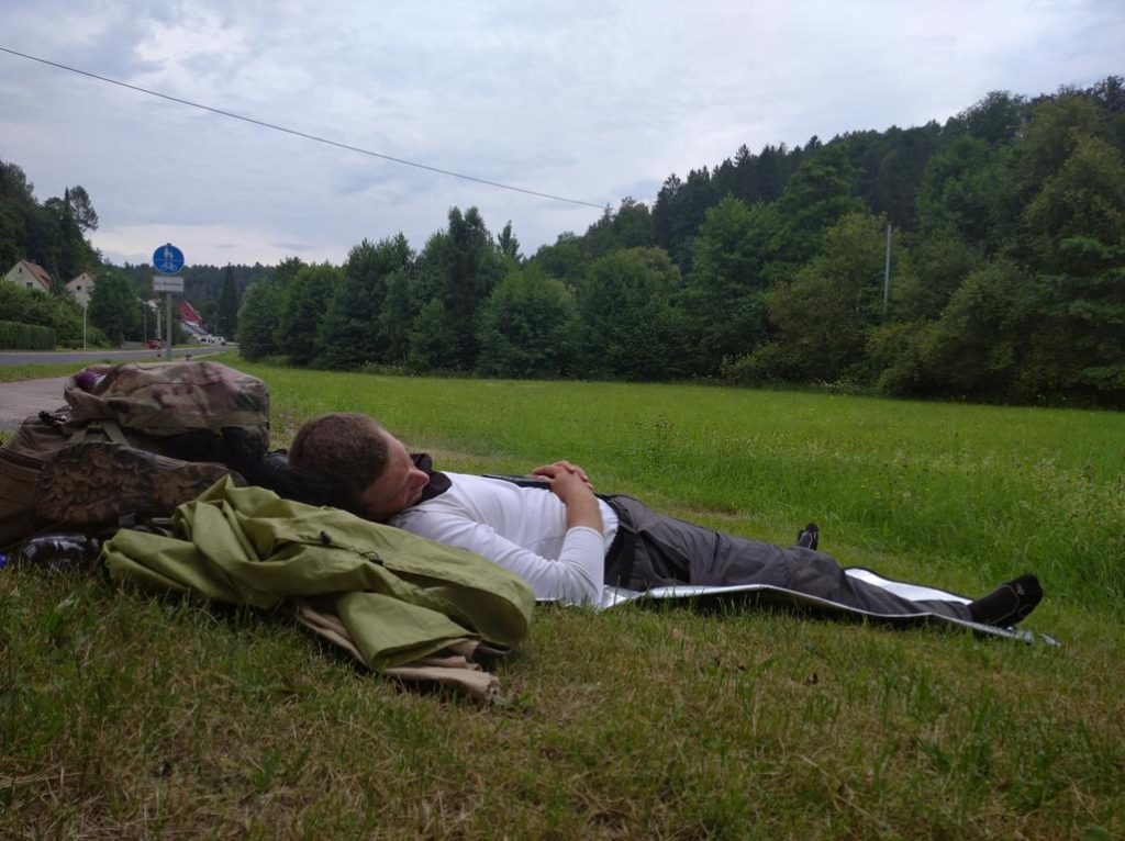 Jasne, że oprócz zmian kulturowych zmieniło nam się za granicą też sporo rzeczy niezależnych od ludzi. Po pierwsze topografia. Teren zrobił się bardziej górzysty, a co za tym idzie coraz ładniejszy dla oka, ale trudniejszy dla nóg. Po drugie czas. Pora roku przeszła z późnej wiosny w środkowe lato niosąc ze sobą uginające się od owoców drzewa i krzaki (z czego z ochotą korzystaliśmy), zmieniając kwitnące niedawno łąki w dywany kolorowych kwiatów, a zielone pola w łany żółtych nadających się niebawem do żniw zbóż. I coraz częściej wspaniałe, wysokie słoneczniki.Co się natomiast nie zmieniło? Też sporo. Święty Jan Nepomucen jak pilnował skrzyżowań, mostów i wodnych zbiorników tak dalej pilnuje. Kilometry w dalszym ciągu wynosiły 1000 metrów lub 1500 kroków i wyciskały ten sam słonawy pot. Ból w łydkach, kolanach i plecach też jakby pozostawał niezmienny. I nawet pogoda w dalszym ciągu nas nie rozpieszczała zsyłając na zmianę albo tropikalne promienie nad miarę upalnego słońca, albo strugi ulewnych deszczów wspomagane często gwałtownymi burzami, przed którymi co chwila musieliśmy się chować. No cóż, do tego wszystkiego zdążyłem się już w trakcie kilkumiesięcznej wędrówki przyzwyczaić i obojętnie jest mi, po której stronie granicy jest, było lub będzie mi boląco, gorąco lub mokro. Jest tylko jedno, co niezmiennie nie jest mi obojętne i sprawia poczucie lekkiego niepokoju, gdy przekraczam którąkolwiek granicę. To pytanie o dobre miejsce pod namiot i spokojny sen. Czy w tej kwestii zmieni się coś po wkroczeniu do Niemiec? Tego oczywiście nie wiedziałem. Pod tym względem w Polsce i w Czechach był stosunkowo duży luz. Namioty rozbijało się gdzie się chciało i już. A w Niemczech? Jak będzie w Niemczech? Czy faktycznie w Niemczech wszystko jest verboten, czyli zakazane i nie będzie gdzie spać?
