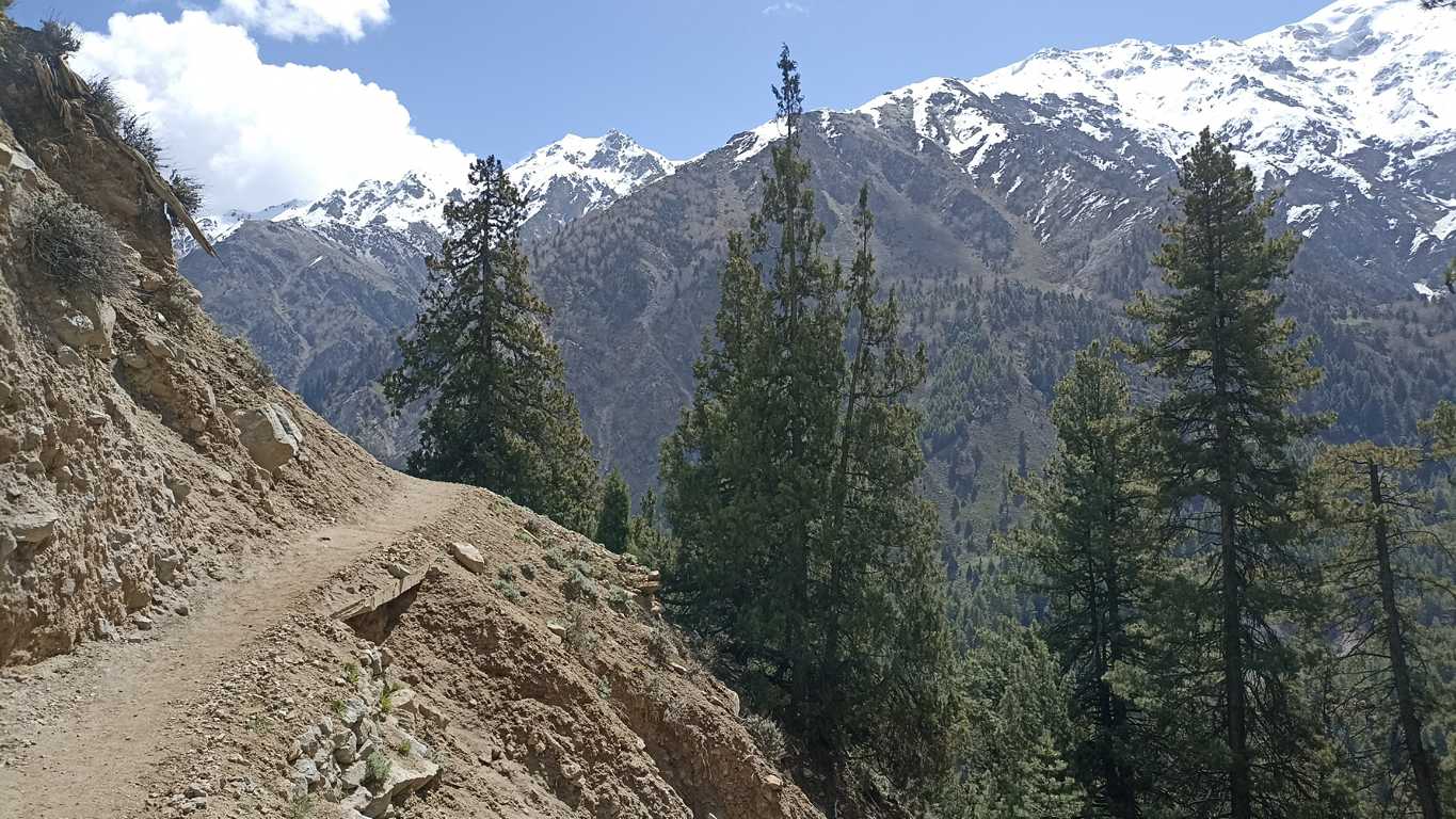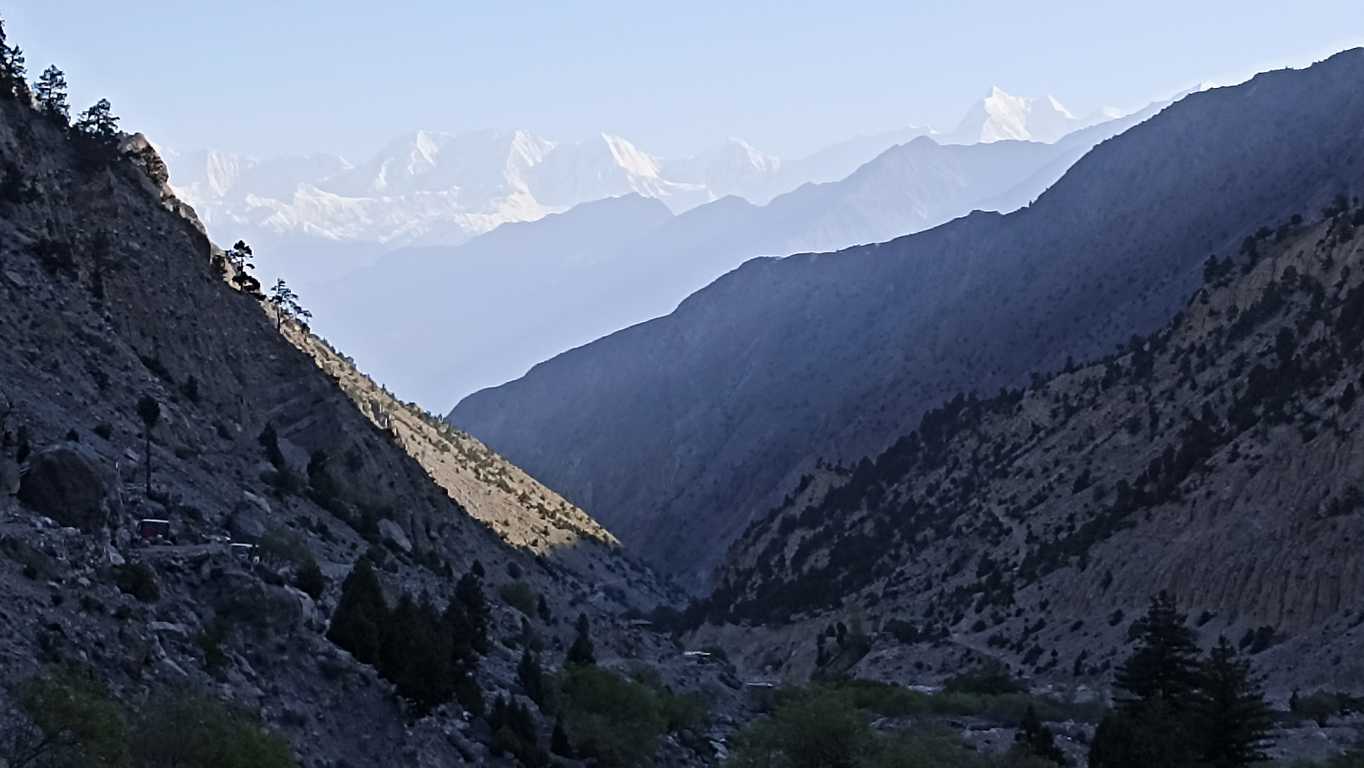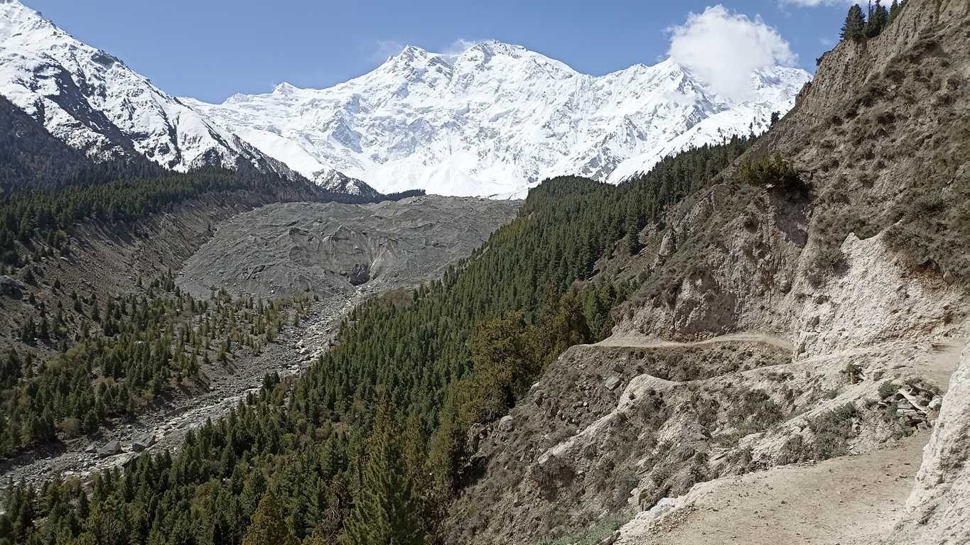 Na pierwszym wzniesieniu, gdy słońce jest już na tyle wysoko by oświetlić wyłaniający się w dali biały szczyt Nanga Parbat, lub którejś z towarzyszącej mu góry (nie jestem pewien), po raz pierwszy oddycham z głęboką ulgą. To, co widzę przed sobą sprawia, że jestem pewien, że dzisiaj nie tylko nic nie będzie inaczej, ale że rozpoczął się właśnie jeden z tych dni, które na długo wpiszą się do mojej pamięci. Okolica jest tak piękna i malownicza, że mimo, iż do celu wędrówki brakuje mi jeszcze kilku godzin, to już teraz nie mogę się nią nacieszyć. Tym bardziej, że będąc zupełnie samemu, mogę się cieszyć i przeżywać całą otaczającą mnie rzeczywistość w zupełnej ciszy i spokoju, co dodaje całości dodatkowego, nieopisywalnego uroku.