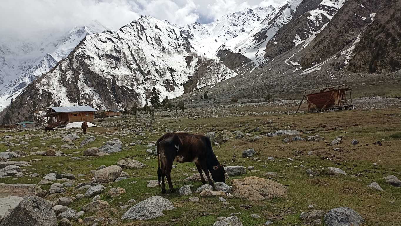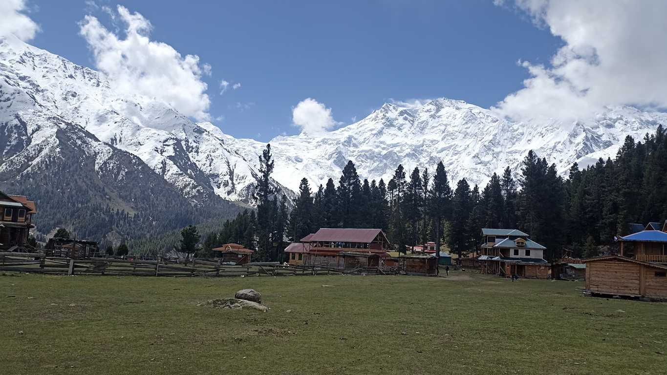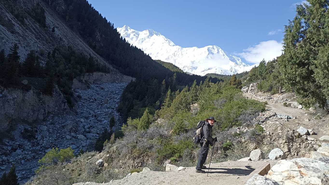 Turystyczne centrum składające się z kilkunastu hoteli wzniesionych z drewnianych bali na przestrzennej polanie, kilku kiosków z napojami i przekąskami, kilku witryn z pamiątkami i oczywiście krążącymi między nimi ludźmi, nieco mi mój spokój zakłóca. Nieco. Tłumów, ani zwykłej w takiej miejscach, turystycznej wrzawy tu nie ma, a spotkanie z sympatyczną grupą z Polski w sumie nieźle wpisuje się w podnangaparbacki klimat. W końcu to taka „Polska Góra”. Naturalnie niedługo cieszymy się zwykłymi Polaków rozmowami. Na szlaku, zwłaszcza w wysokich górach nie można zbytnio szafować czasem. Mi spieszno dalej w górę, im w dół do jeppa. Stąd do stóp Nanga Parbat mam jeszcze dobre półtorej godziny, a przed zmierzchem muszę wrócić. – Trzymajcie się zdrowo i uważajcie na siebie, żegnam się po pstryknięciu obowiązkowego grupowego zdjęcia i ruszamy dalej