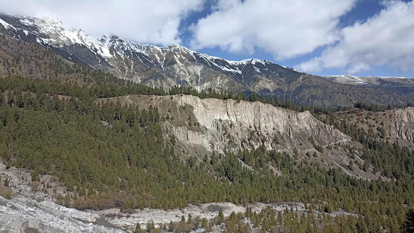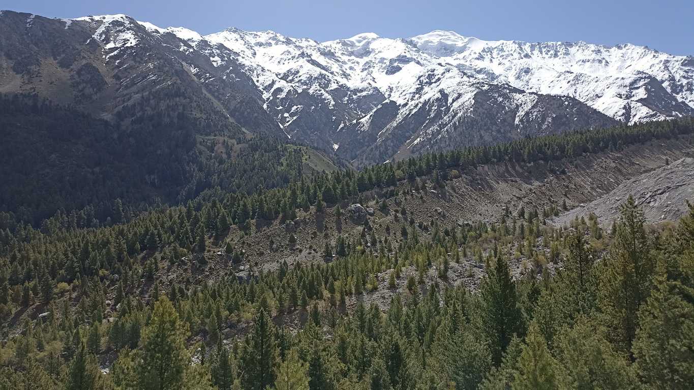 Przewyższenia już znacznego nie mam. Droga wije się lasami, wzdłuż wąwozu lub jego dnem i szybko znika za mną. Dopiero krótko przed celem znowu jest pod górkę i nieco ciężej. Ale to nic. Zdecydowanie większym utrudnieniem jest to, że robi się coraz bardziej mokro i muszę nieźle się gimnastykować by nie wpaść po kostki lub wyżej w błoto. Topiąca się śnieżna czapa ośmiotysięcznika, będącego już tuż, tuż przede mną, obficie zalewa prowadzące do niego ścieżki, dostarczając kolejnej, nie powiem, że najprzyjemniejszej atrakcji. Szczęśliwie, prawie, suchą nogą udaje mi się w końcu dotrzeć przed najjaśniejsze oblicze szczytu, który wczoraj zwrócił moją uwagę na mapie i zdezorganizował cały mój plan. Dobrze. Teraz widzę, że się opłacało, a cały pot, wylany wczoraj i dzisiaj nie spłyną na marne. Przepiękna biała góra, stojąca przede mną w całej swojej krasie, z łatwością otwiera w zachwycie me usta, przez które wydobywa się jedno, jedyne, niczym niewymuszone słowo – CUDNIE!!!