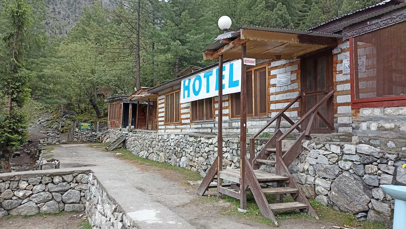 Hotel? Hotel, to brzmi dumnie przy drewnianej chacie bez prądu i innych udogodnień, jakie oferują zwykle hotelarskie usługi. Dla mnie w sam raz. Właśnie takie miejsca najbardziej lubię. Proste, tanie wkomponowane w tubylczą rzeczywistość. Szerokie drewniane łóżko z grubym kocem, kukurydziany placek usmażony na palenisku podkładanym drewnem, ławka przed drzwiami i najpiękniejszy widok na majaczące w oddali, dotykające nieba białe szczyty Karakorum, to spełnienie wszystkich moich marzeń ostatnich dni. Nie mówiąc o tym, że jeżeli Bóg da, to jutro stanę twarzą w twarz z jednym z najsławniejszych ośmiotysięczników, z Nanga Parbat. Już się cieszę i trudno mi doczekać jutra. Droga nie powinna być wymagająca. Właściciel hotelu mówi, że sporo turystów tędy chodzi, aczkolwiek nie zatrzymują się tutaj, tylko śpią wyżej w górach w jednym z kilku ustawionych tam hoteli (to te kwadraciki, które widziałem na mapie). Wjeżdżając jeepami z głównej drogi, nie tracą, jak ja, czasu i energii i mogą sobie pozwolić, by od razu iść dalej. Ja się nie spieszę. Mam czas. Mogę poczekać, odsapnąć i nacieszyć się do woli miejscem, bo jest czym.